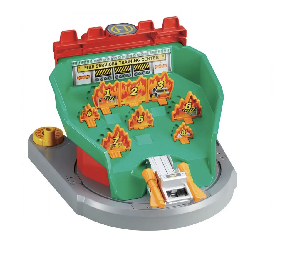 ハンドルを回すだけで消防署が消火訓練所に「ぐるっとチェンジ」する変形ギミックが特徴です。