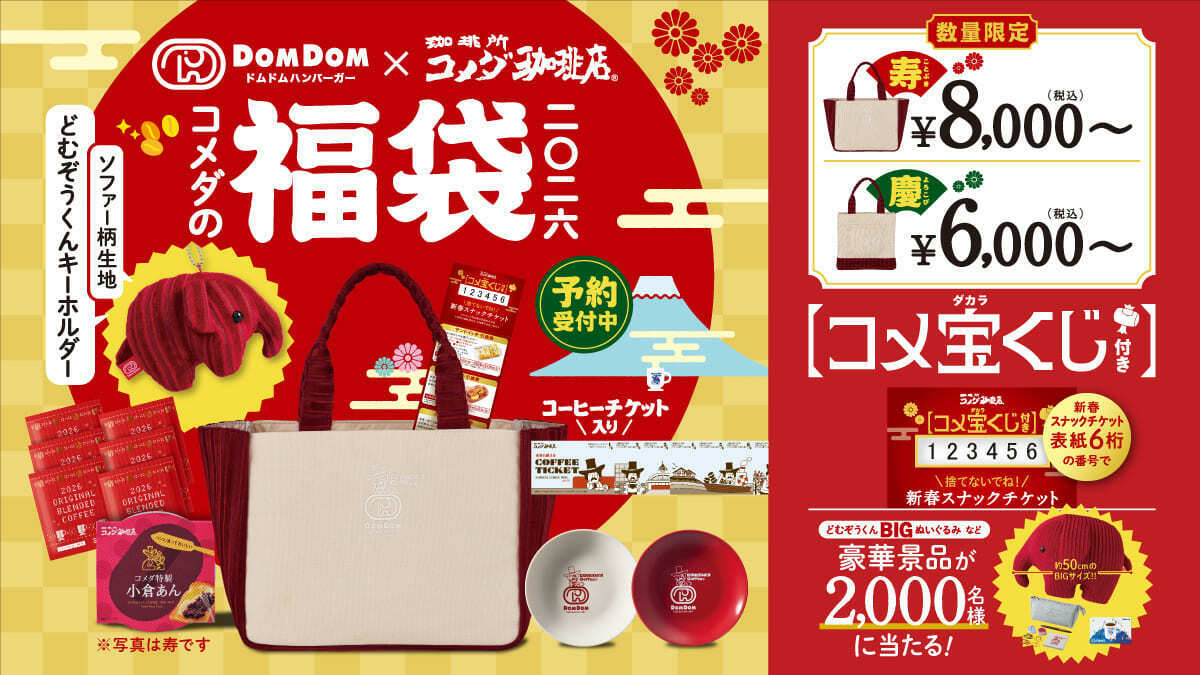 コメダ珈琲では、2026年の福袋は「コメダ珈琲店×ドムドムハンバーガー」を販売します!