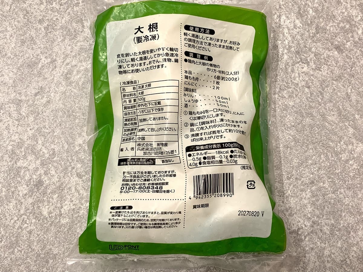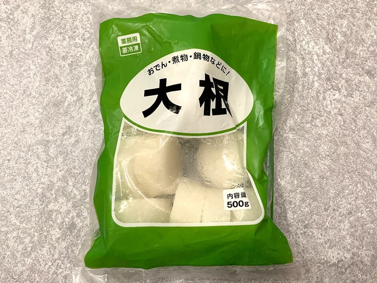 おでんを作る上で欠かせない大根は、業務スーパーの冷凍コーナーに置かれています。やはり、業務スーパーには冷凍野菜が豊富に置かれているので便利ですよね♪
