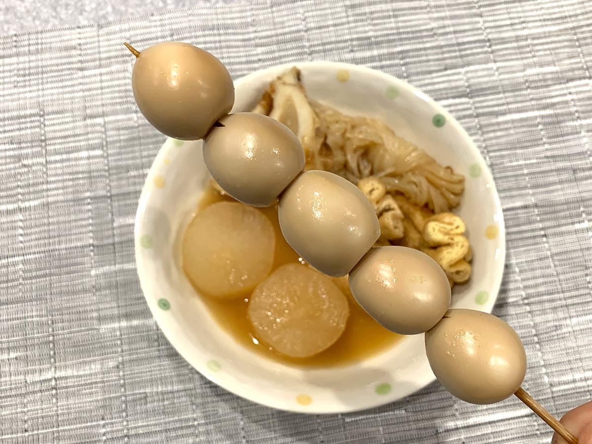 小さいうずら卵ですが、黄身の割合が多いため通常サイズのたまごに比べてコク深さを堪能できました♪パクッと一口で食べられるお手軽感も良いですし、ダシが早く染みるのも嬉しいポイントです!