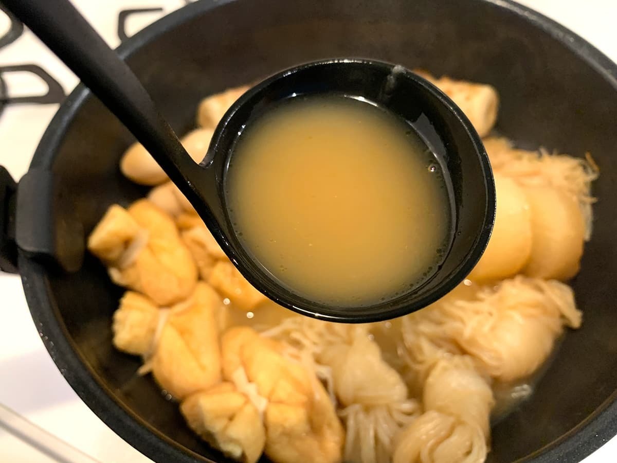 醤油仕立てのおつゆで、かつお節と昆布だしが効いた一品。寄せ鍋に加え、おでん・けんちん汁・炊き込みご飯・茶碗蒸しなどにも使えると書かれていたので、今回使ってみました!