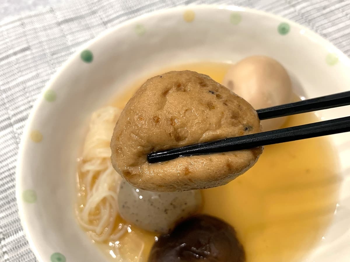 ダシが中にたっぷり染み込んでおり、噛むたびに広がる旨味が絶品!豆腐をベースにしている具材ですが、油揚げの香ばしさも相まって満足感は高いです♪