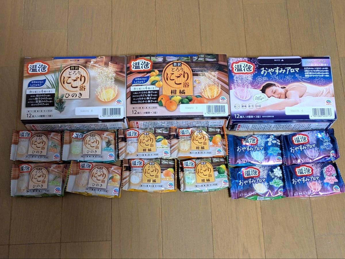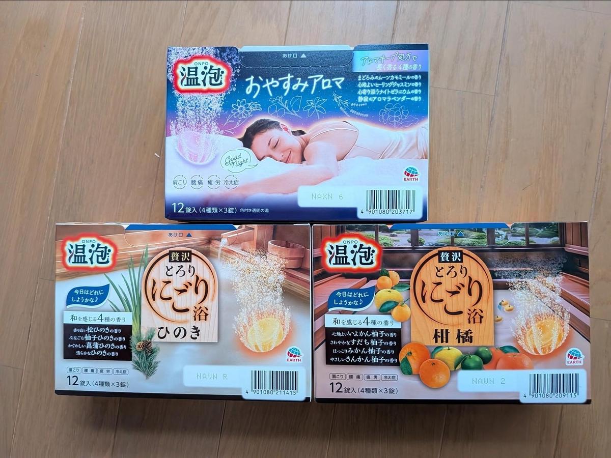 3つの箱はそれぞれ「おやすみアロマ」「とろりにごり浴ひのき」「とろりにごり浴柑橘」のシリーズで、その日の気分によって入浴剤を選ぶことができます。