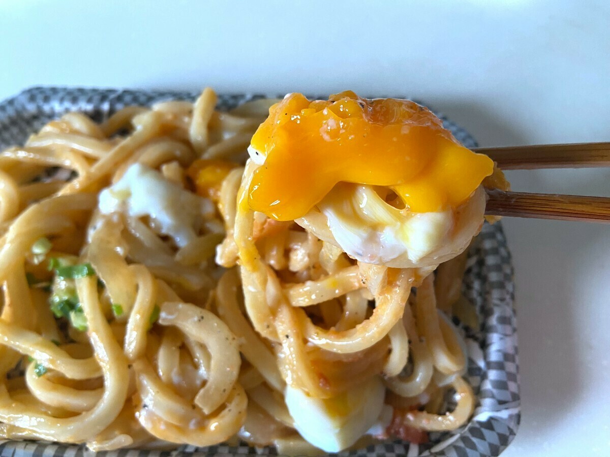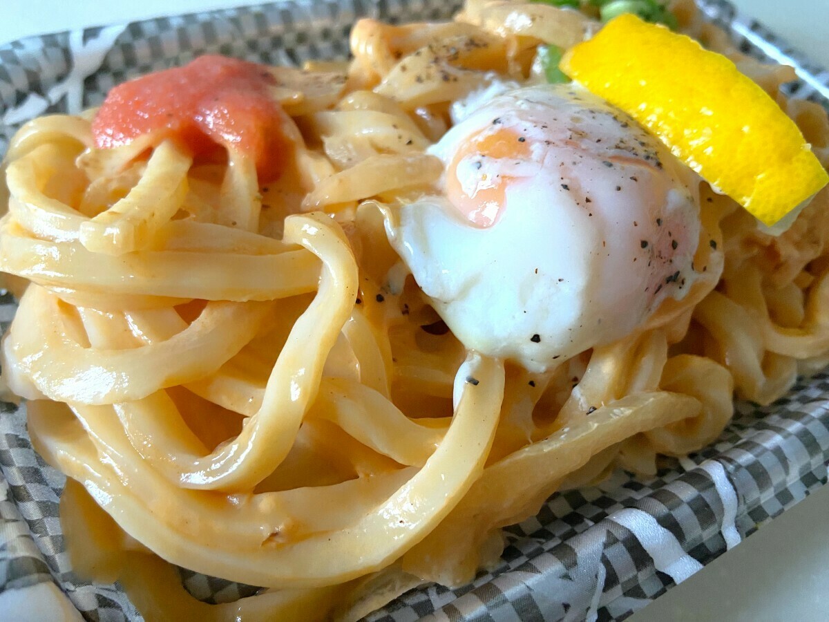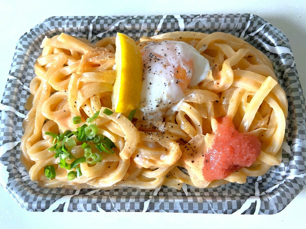 明太クリームがたっぷりからんだ太めのうどん、上にはとろっと温泉卵がトッピングされていて見た目も映える、美味しそうな一品。