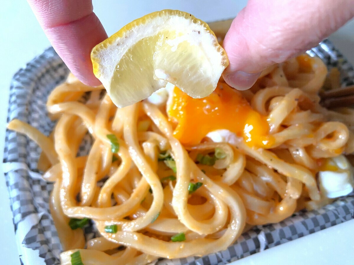 まったり濃厚な味わいの明太クリームうどんにフレッシュな酸味がプラスされてまた違った雰囲気になります。