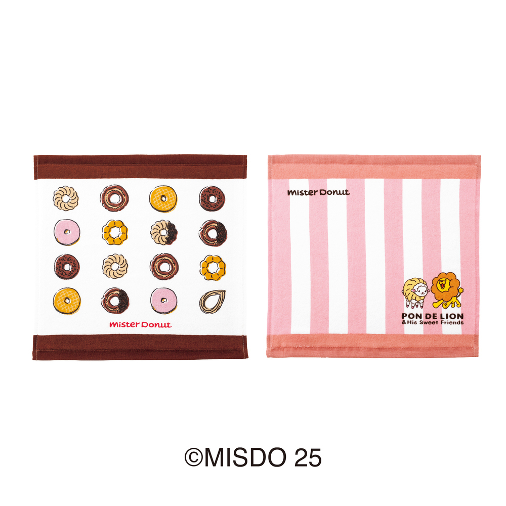 ポン・デ・ライオンとフレンチウーラーが描かれた可愛らしいストライプ柄と、人気のドーナツが描かれたドーナツ柄のハンドタオル2枚セットです。
