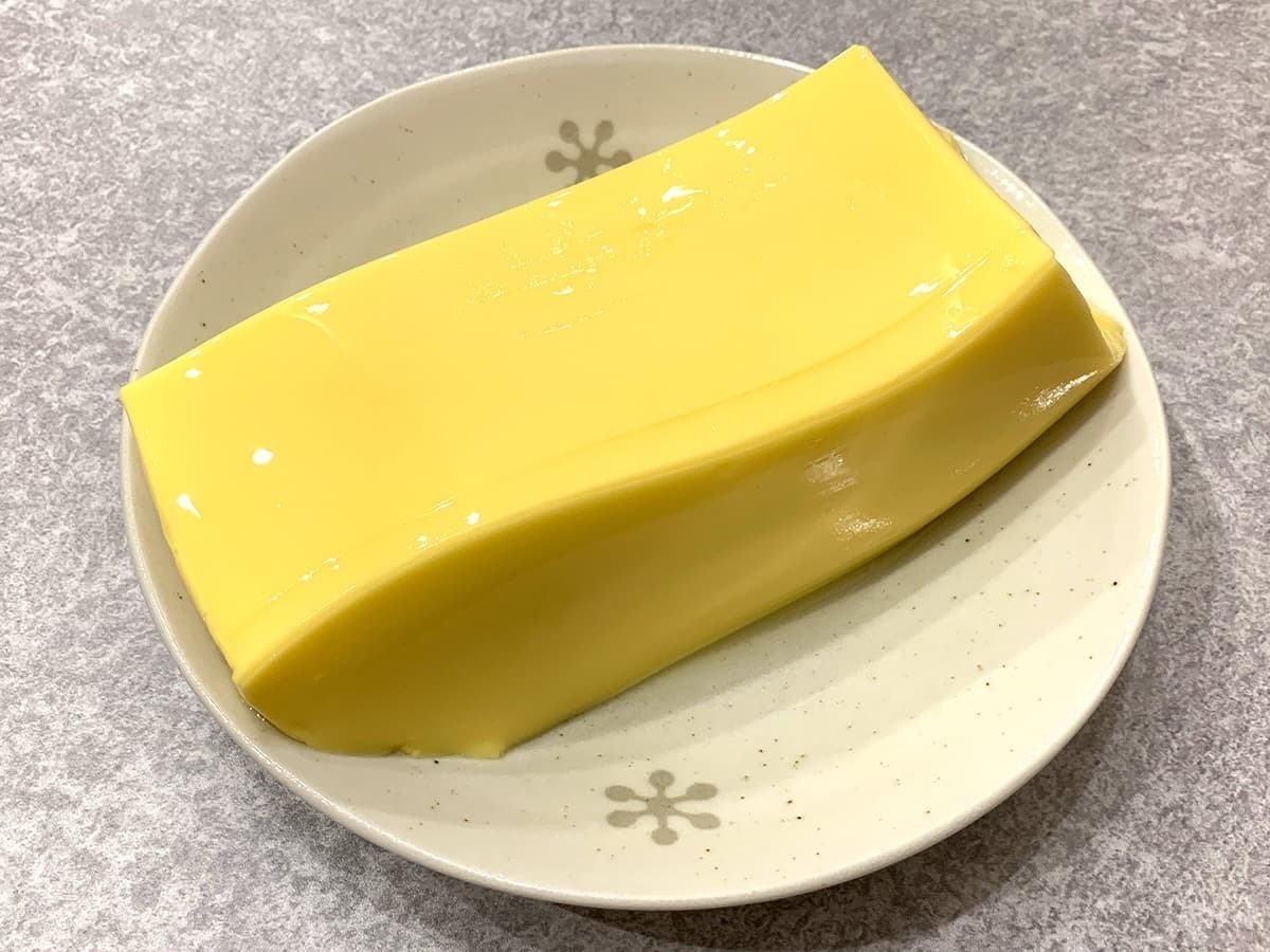 大皿に出すと容器いっぱいに詰まったプリンが圧巻のボリュームで、表面には食欲をそそる光沢感があり、ぷるぷるとした質感が楽しめます。