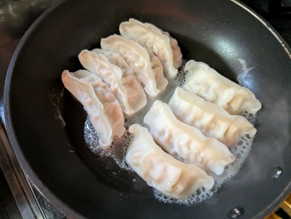 フライパンに凍ったままの餃子を並べて、フタをして焼くだけ。