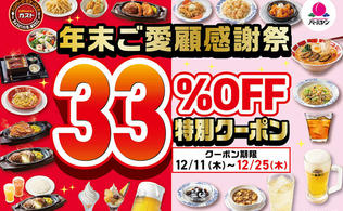 【ガスト・バーミヤン】「年末ご愛顧感謝祭クーポン」キャンペーン実施!33%オフ特別クーポン配布!半額もある♪