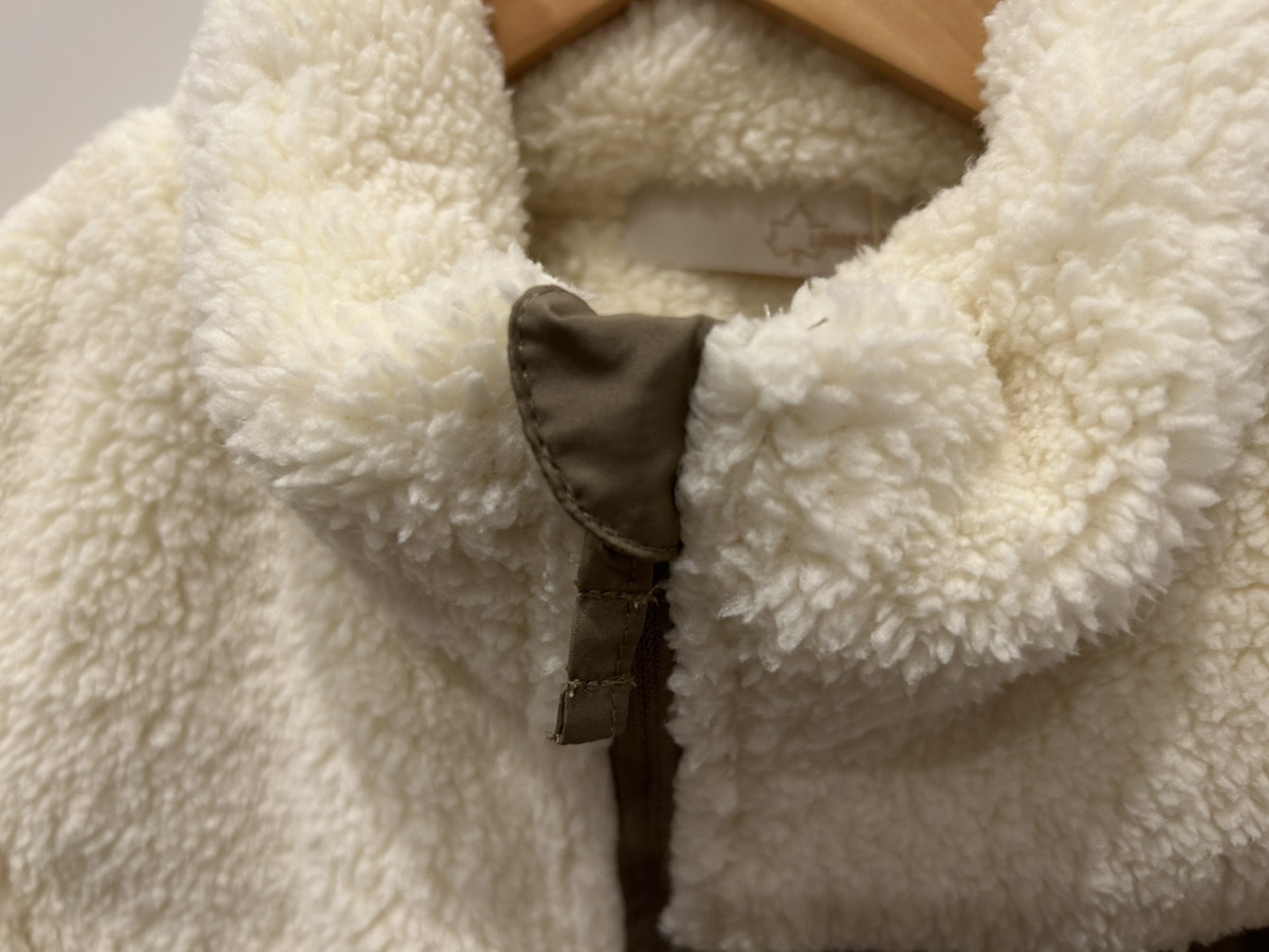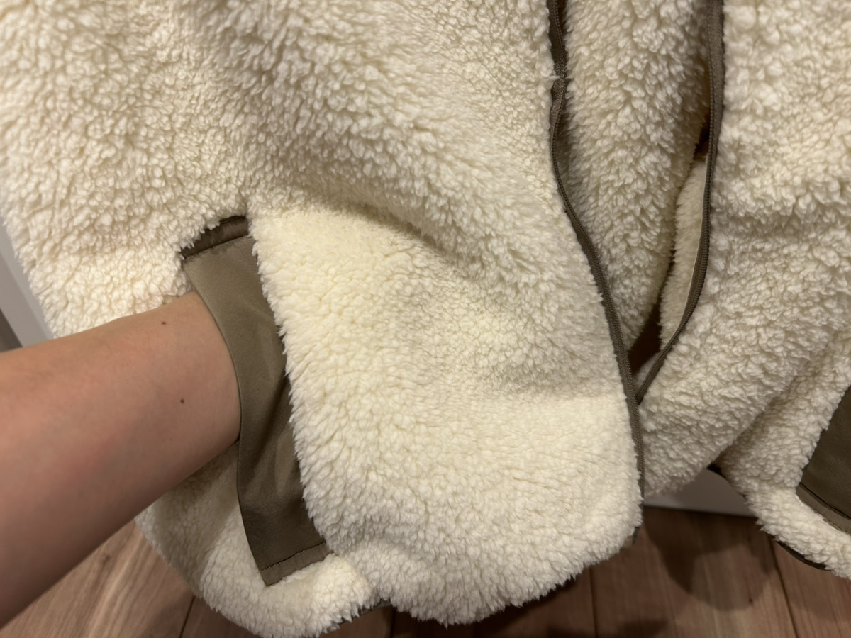 ポケットは外側、内側、胸元の計4か所に備わっており、特に外側のポケットは手がすっぽりと収まるサイズ感で、ボアと裏地による3層構造がお腹周りの風を防ぎ、ハンドウォーマーのような役割も果たします。
