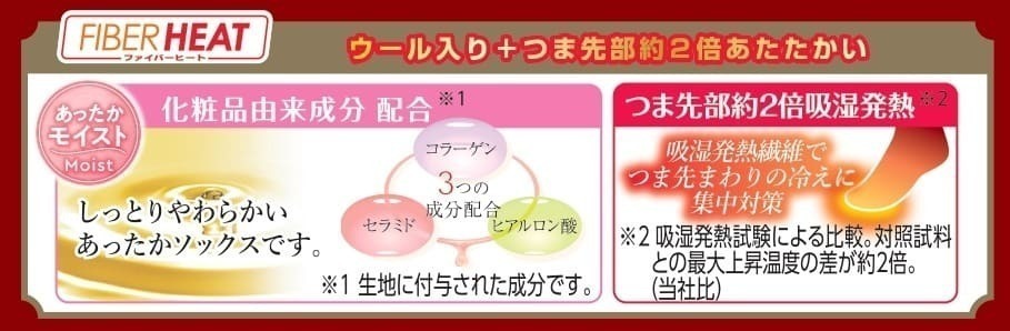 この商品は、体から出る湿気を吸収して発熱する「FIBER HEAT」の機能に加え、「あったかモイスト」シリーズとしてヒアルロン酸、コラーゲン、セラミドという3つの美容成分を配合しているのが特徴です。
