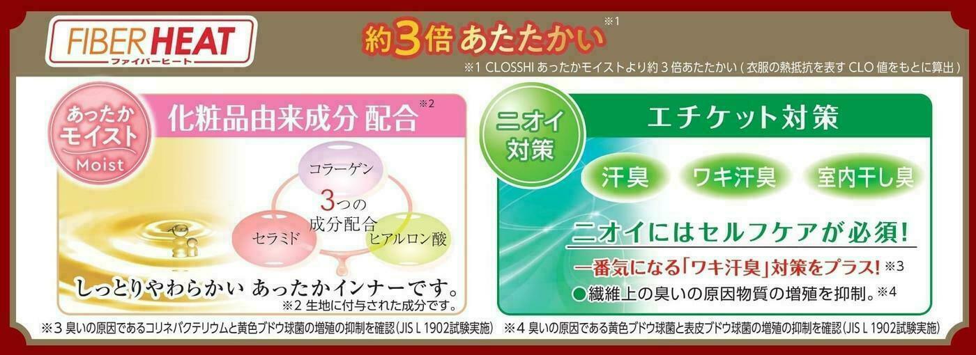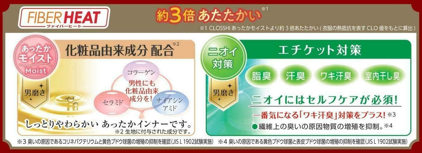 その中でもFIBER HEAT SUPER PREMIUM「あったかモイスト」インナーは、従来のCLOSSHI FIBER HEAT「あったかモイスト」と比較して約3倍の保温力を実現した製品。
