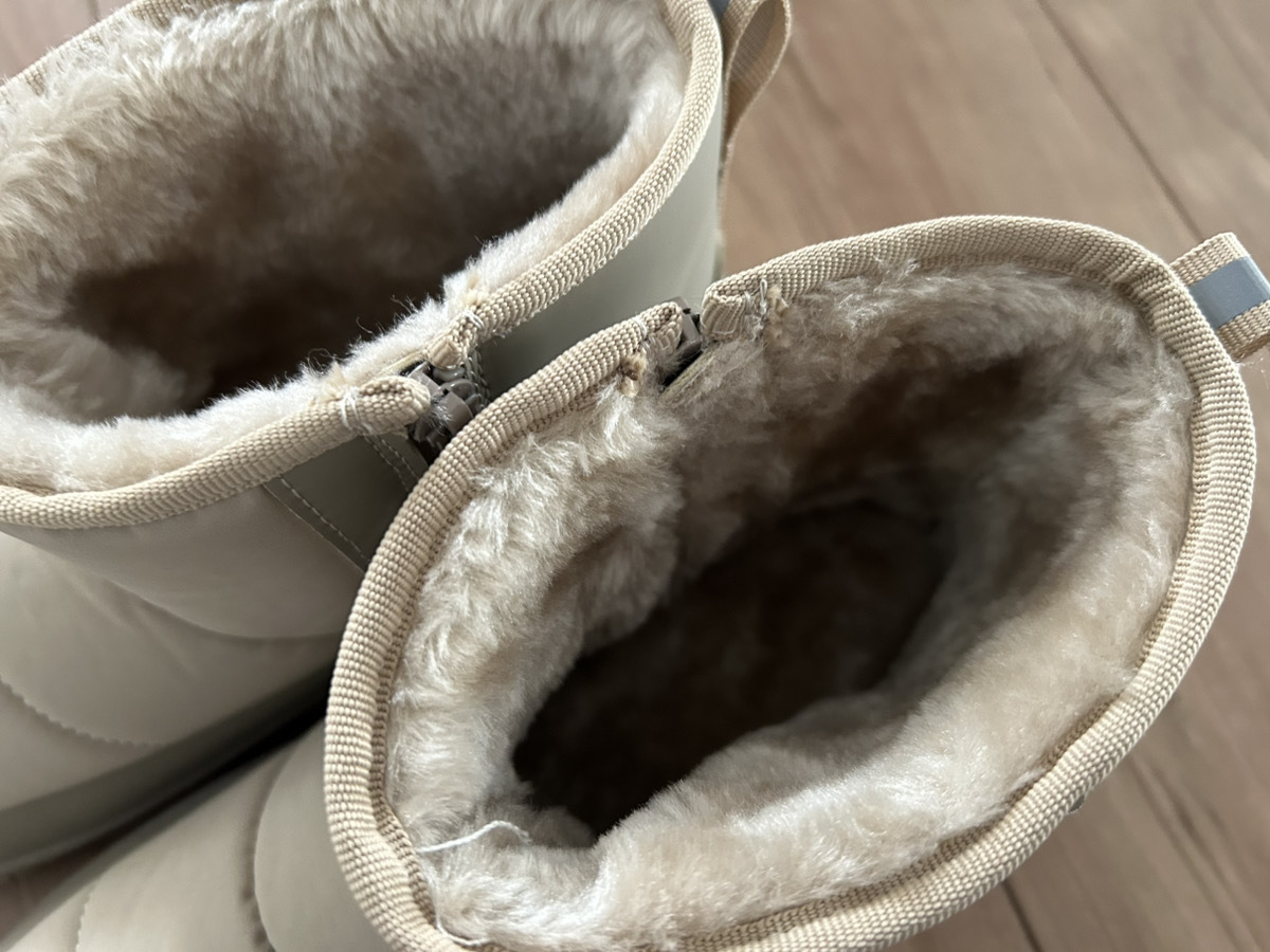 店頭で目を惹いたのが中のモコモコ♪光沢感のあるボア素材で、中がとってもあたたかそう!