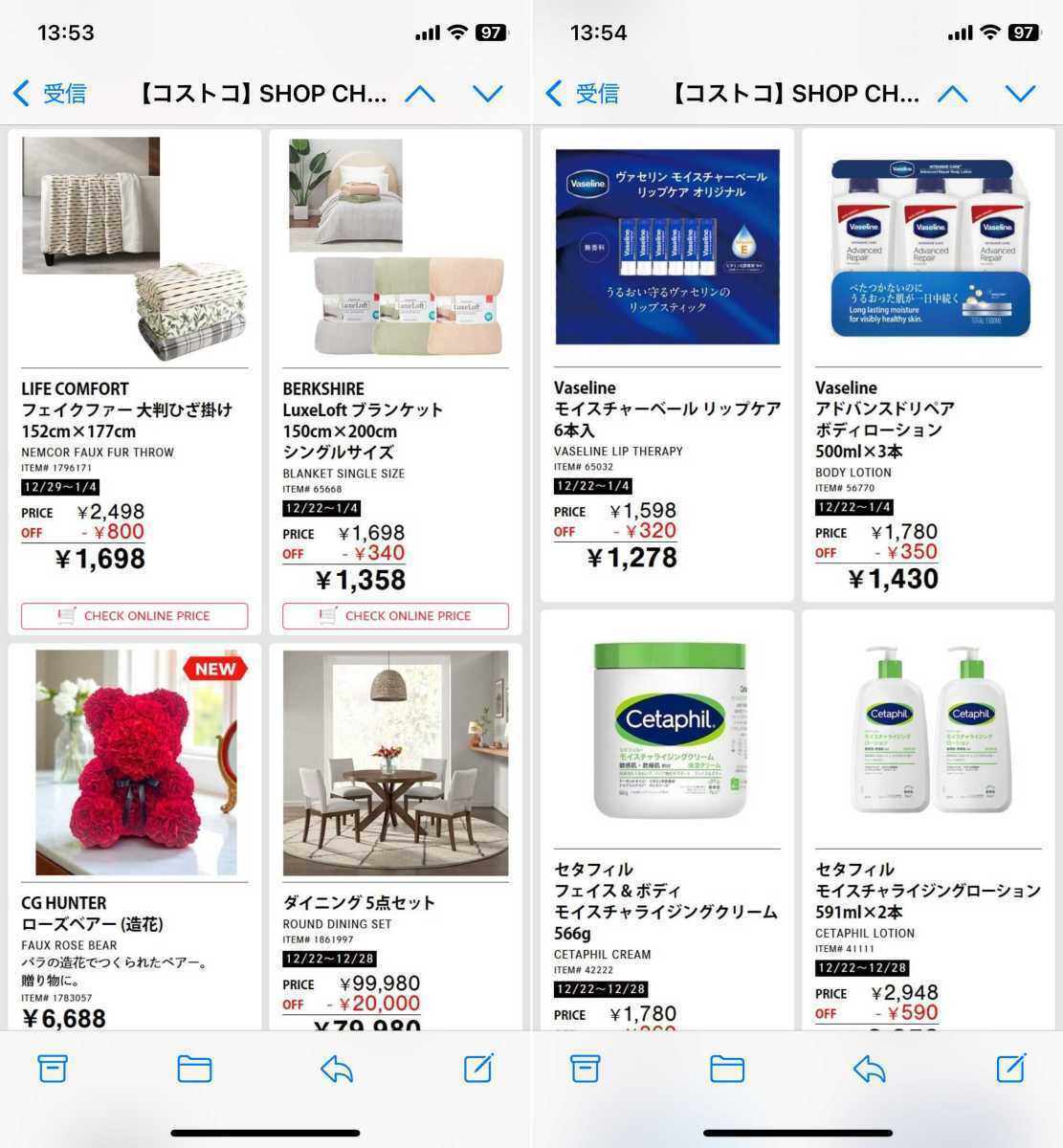 コストコのメルマガでは割引情報が配信されていますが、意外にも商品量は多くお得な情報が満載です!