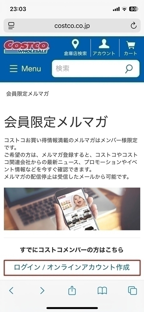 登録手順ですが、まずコストコのメルマガ登録ページへ遷移し、「ログイン / オンラインアカウント作成」をタップします。