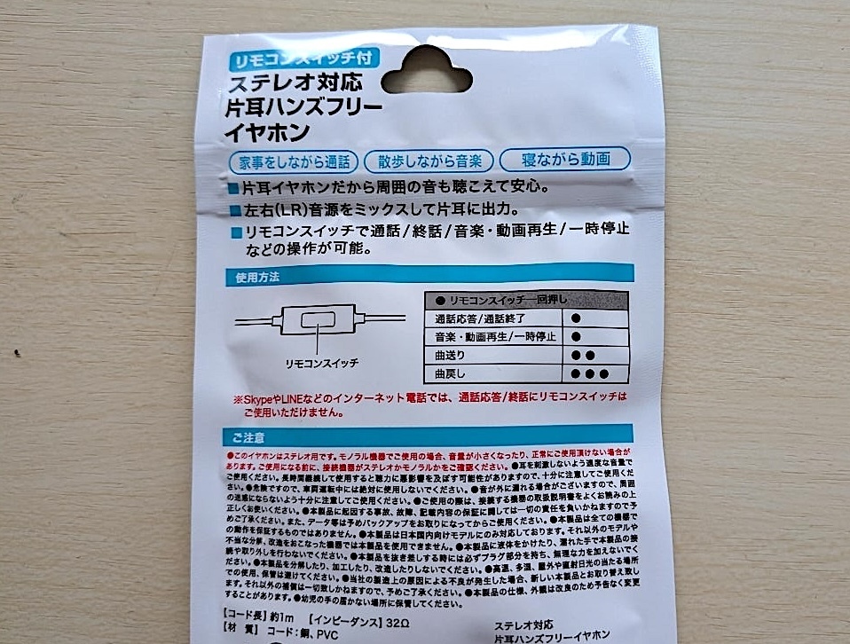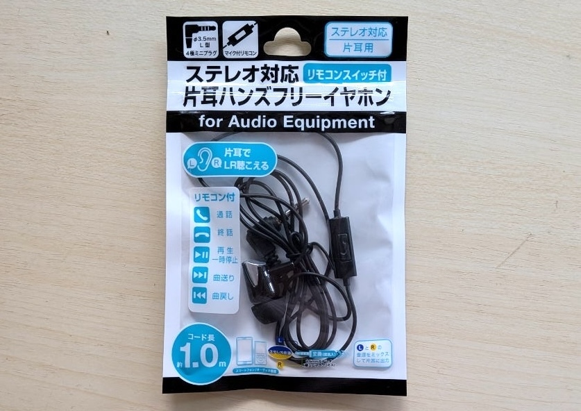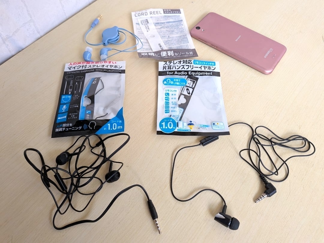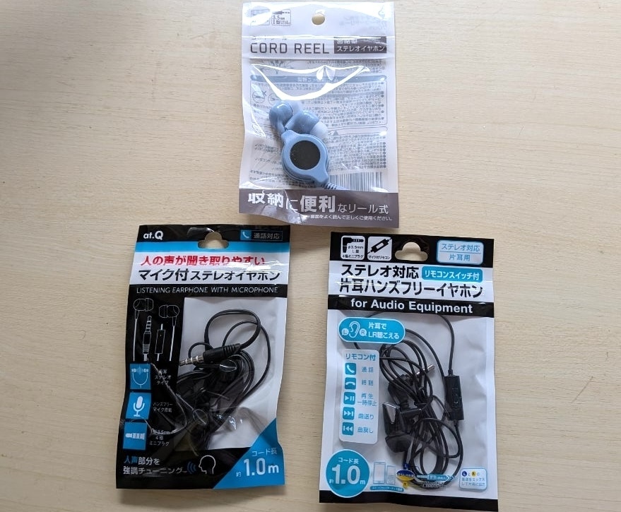 今回購入したのは、「コードリール イヤホン」「ステレオ対応 片耳ハンズフリーイヤホン」「人の声が聞き取りやすい マイク付きステレオイヤホン」の3種類です。