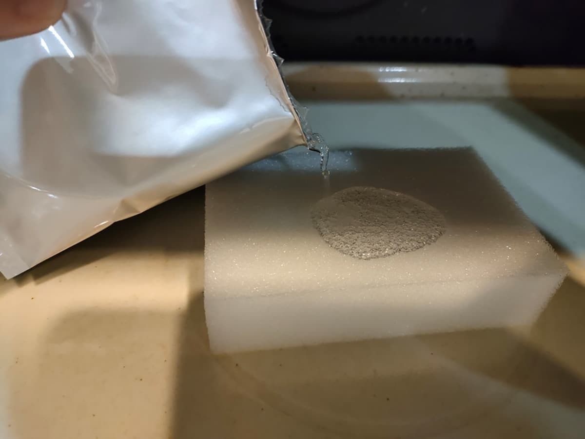 洗浄液は量が多いため、スポンジに垂らすと液が出てきてしまいました。キッチンが洗浄液でベタベタにならないよう、電子レンジの庫内の中にスポンジを置き、洗浄液を注ぐのがおすすめです!