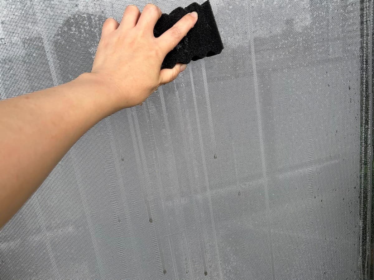 実際に網戸の掃除にスポンジを使ってみました。濡らさずとも使えるようですが、濡らすとより効果があるとのこと!