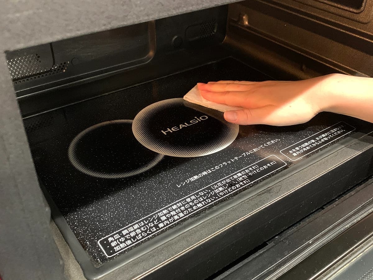 加熱してみると、庫内が蒸気で白く曇っているのがわかりますね!さらに1~2分置くことで、頑固な汚れもふやけて拭き取りやすくなります!