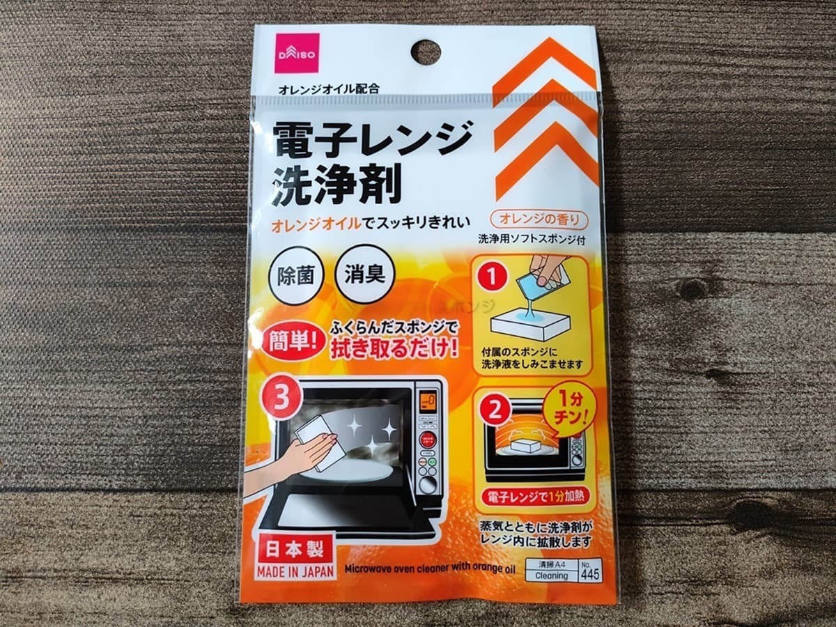 オレンジオイル配合で、電子レンジの庫内を拭き取るだけで除菌・消臭を行えるアイテム。中には洗浄用ソフトスポンジと洗浄液が入っていました。