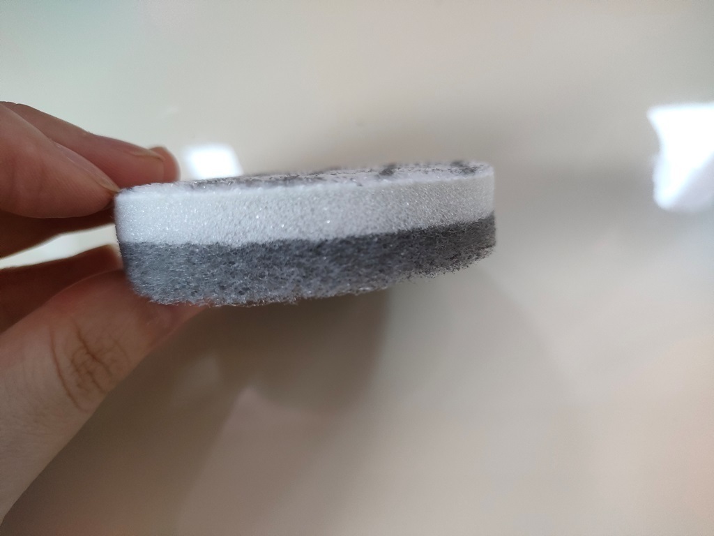 小さな丸いスポンジは、頑固な汚れに適したフィルム生地と、細かな汚れに適したナイロン不織布生地の2層構造で使い分けが可能です。モノトーンの色味やデザインもインテリアを邪魔しません。