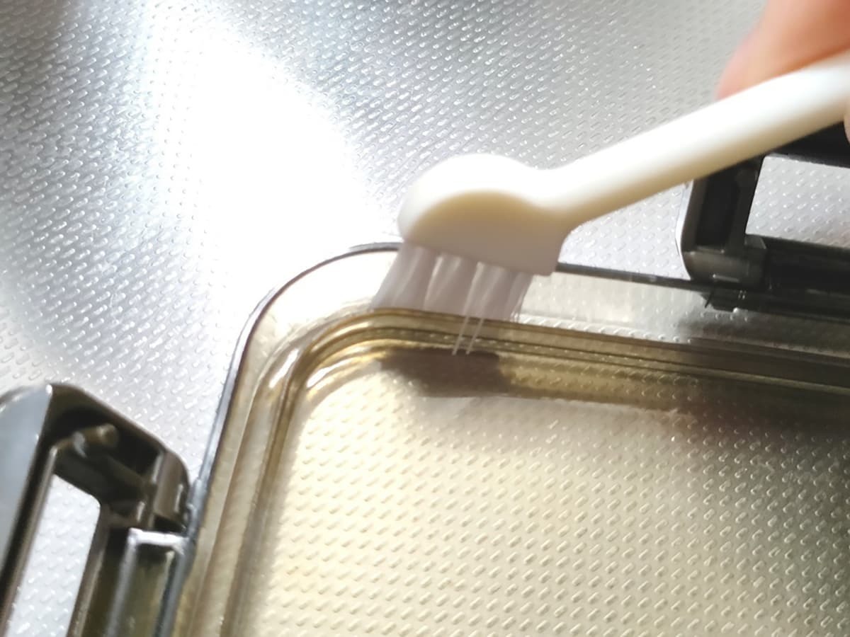 試しに、お弁当箱の蓋の溝部分を擦ってみましたが、ぴったりフィット!スポンジでは取り除くのが難しい汚れも綺麗にできます♪