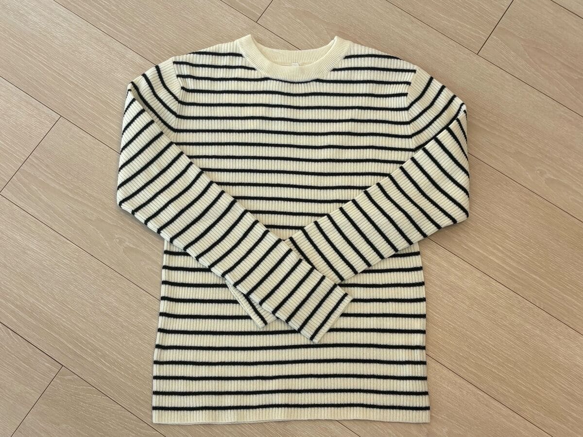 続いては1枚あると助かる、シンプルなボーダーのニットです。