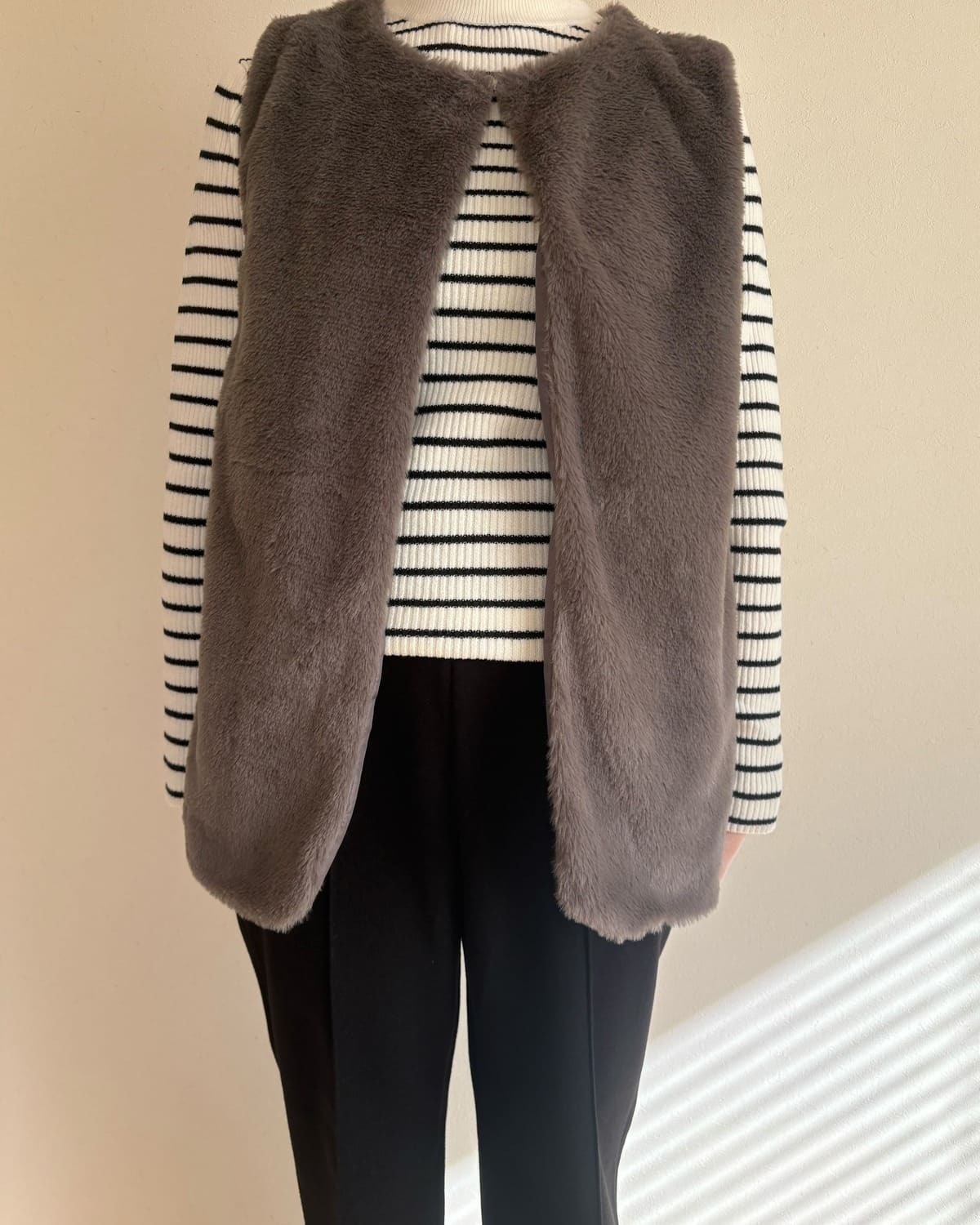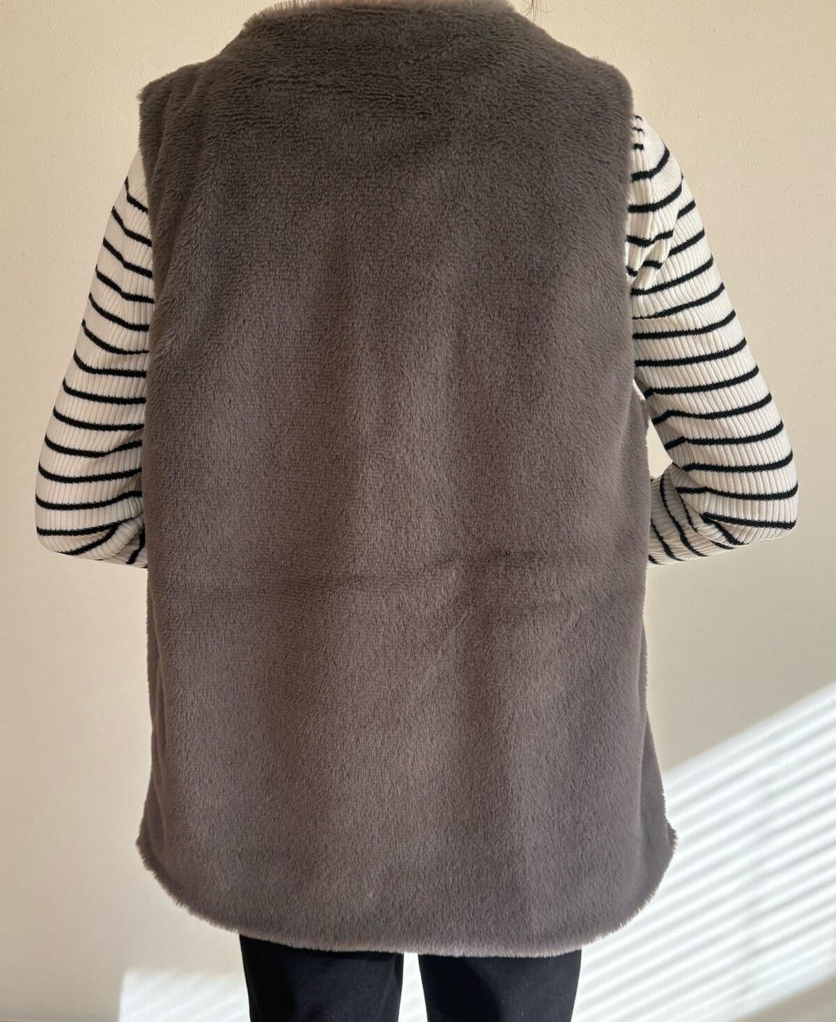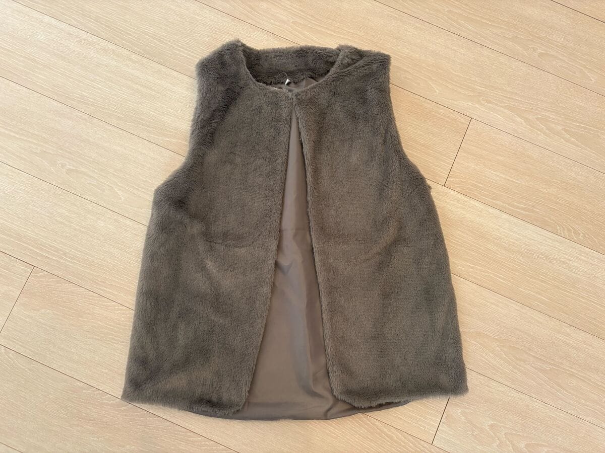 ふわふわした見た目が可愛いらしいグレーのボア生地のジレです。