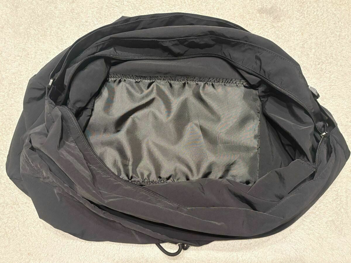 外側は大きなポケットになっていますが、紐を絞ってみるとバッグがコンパクトに!