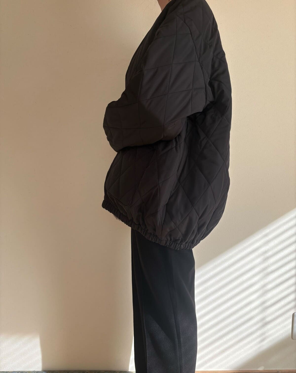 厚手のセーターを着込んでも、ガバっと羽織って、ゆったり着られそうです。