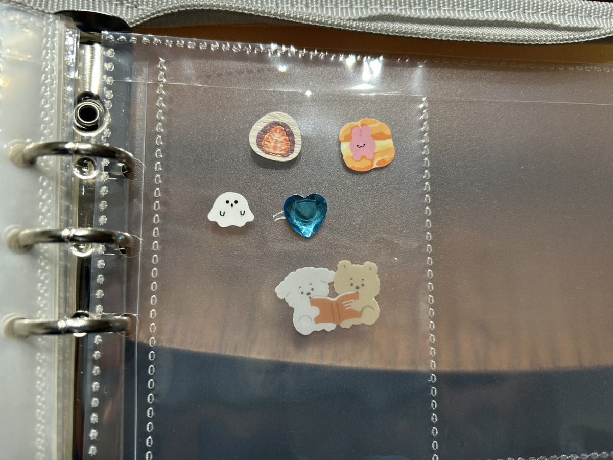 ぷっくりシールなど硬めのシールは、塩化ビニル樹脂のポケットに直接貼って剥がせます。