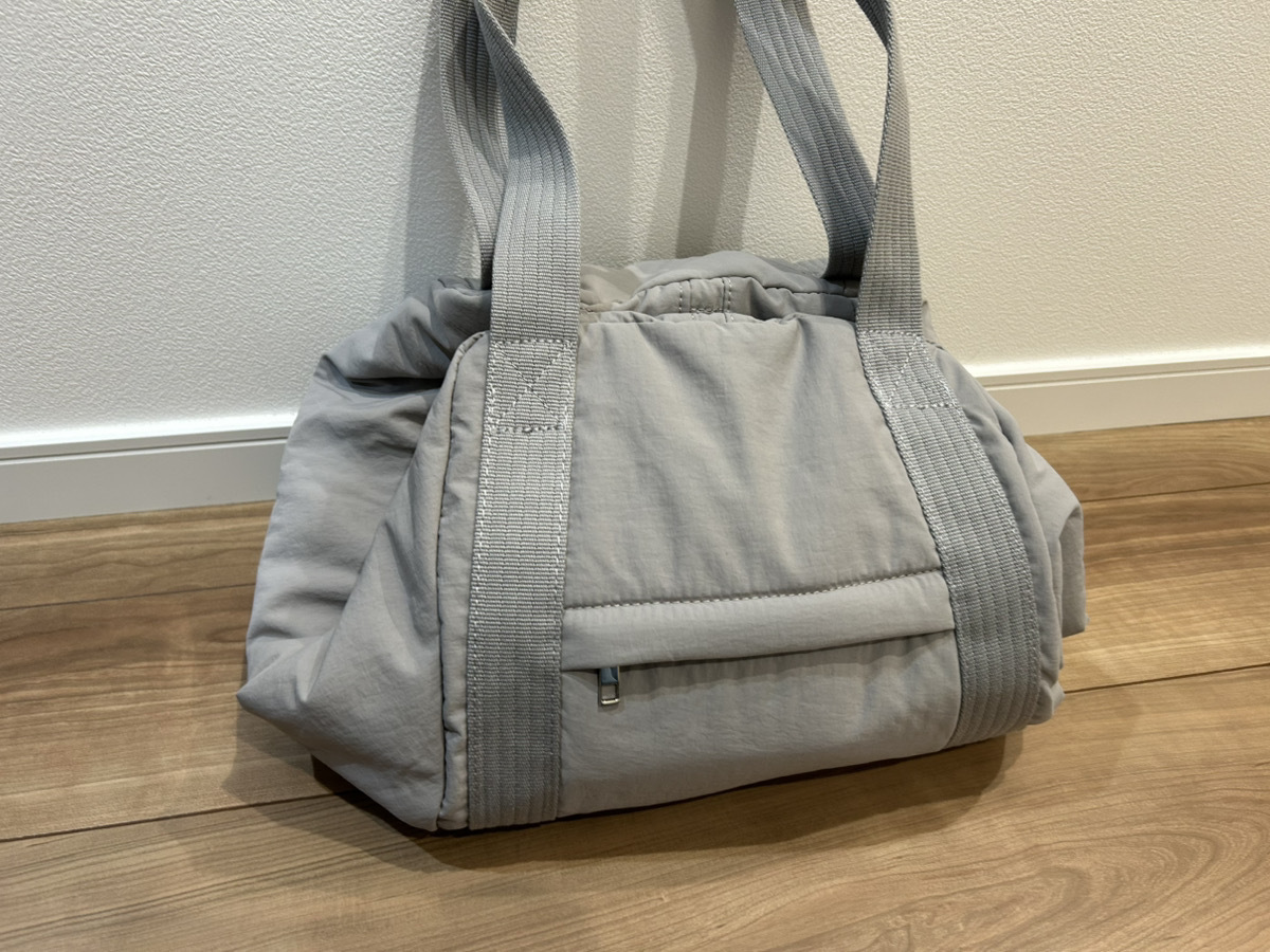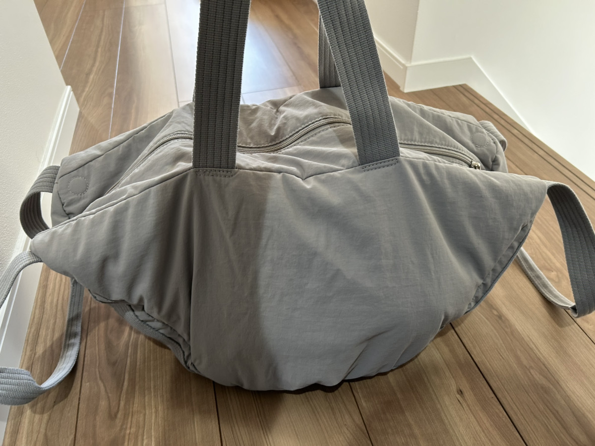行きはトートバッグ型でコンパクトに持ち歩き、お土産などで荷物が増えた帰りはボストン型に広げて使う、といった使い分けも便利そう。