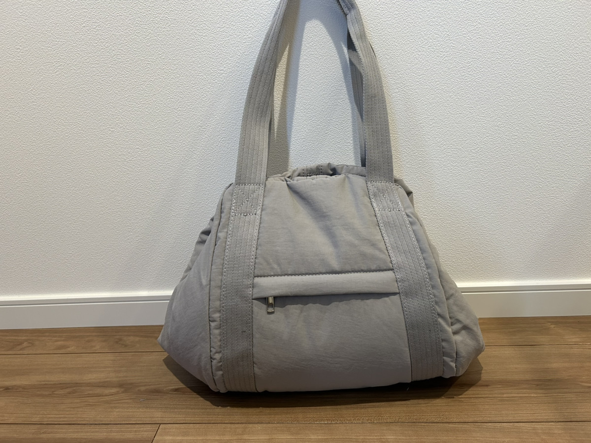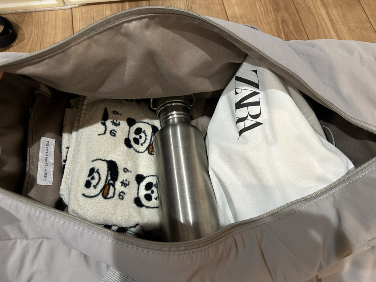 左にタオルと水筒、ポケットにお財布やカギ、リップなどの小物類、右にシューズを入れてみたら、マグネットもしっかり止まってちょうどいい♪。
