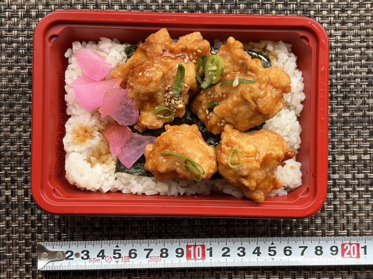 大きな鶏の唐揚げの下には海苔が敷かれています。