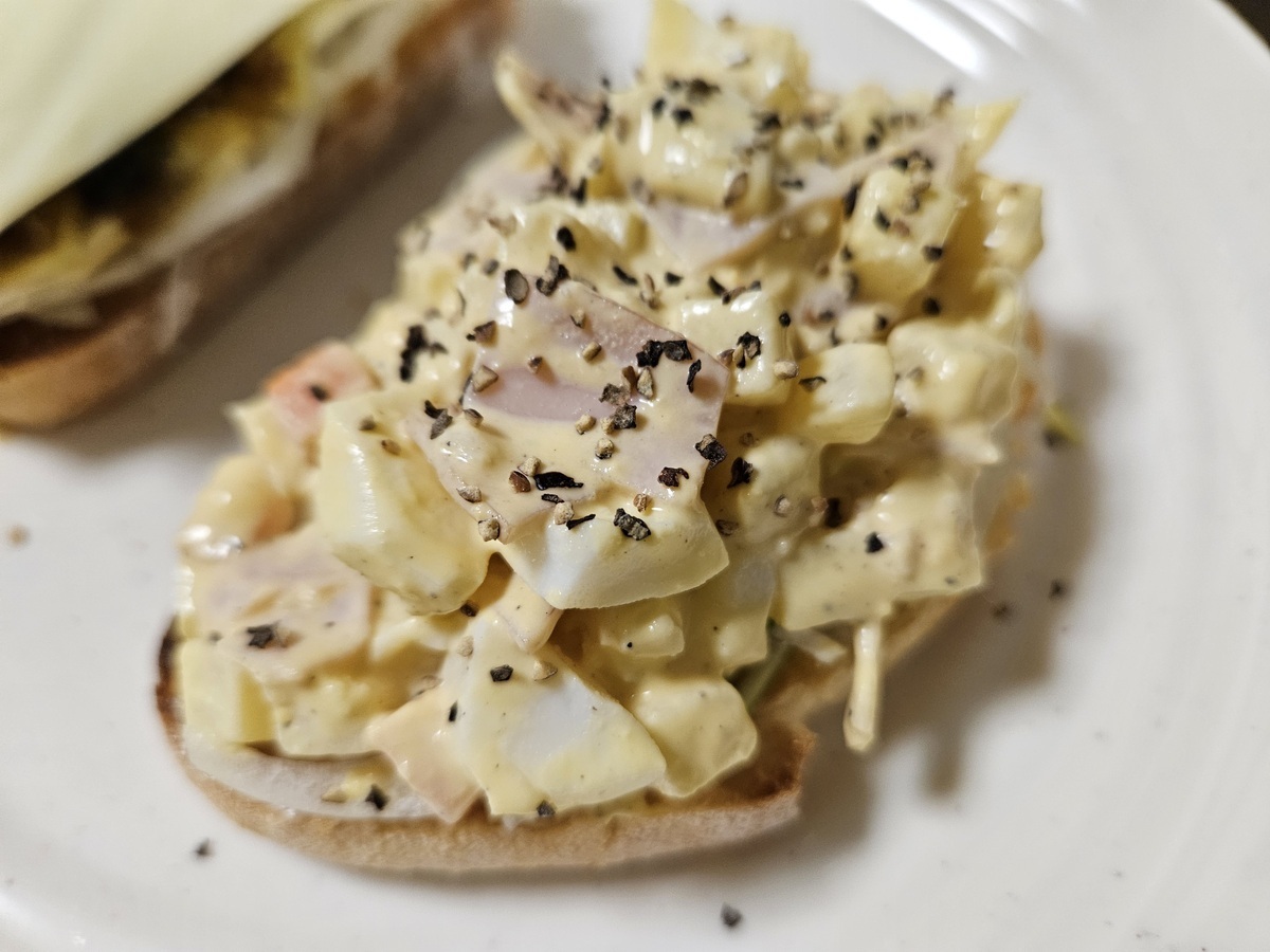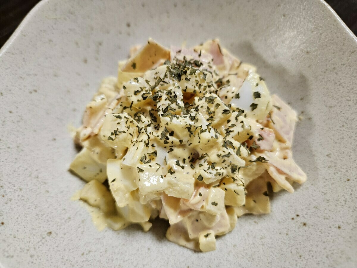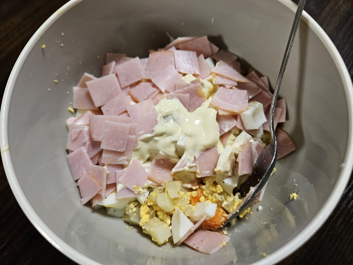 少し冷ました『ポテトミックス』に、ハムやゆで卵など好きな具材を追加して、マヨネーズと塩コショウなどを加えて混ぜ合わせます。