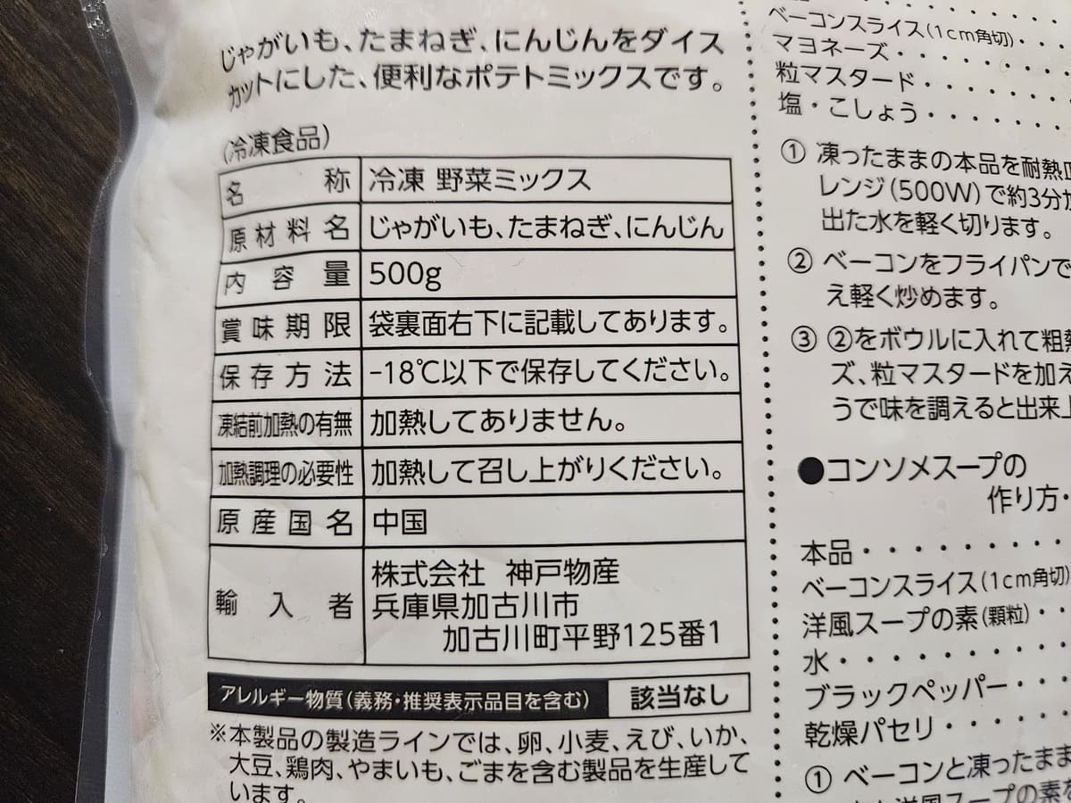 『ポテトミックス』は、内容量500gで税込257円!野菜の原産国は中国です。