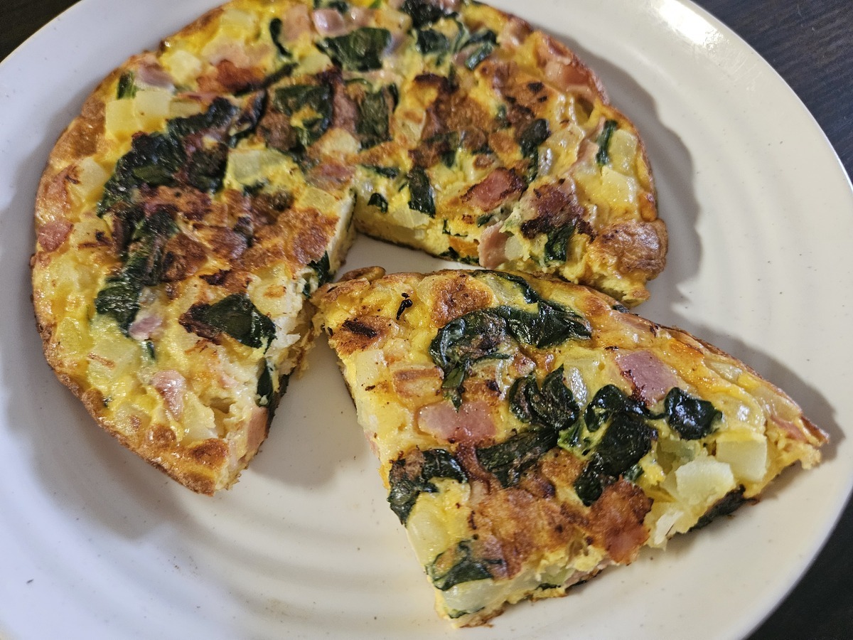 ほかにベーコンや残りもののホウレンソウ、溶けるチーズ・塩コショウを適量入れて混ぜたらフライパンにすべて流し込みじっくりと焼いていきます。