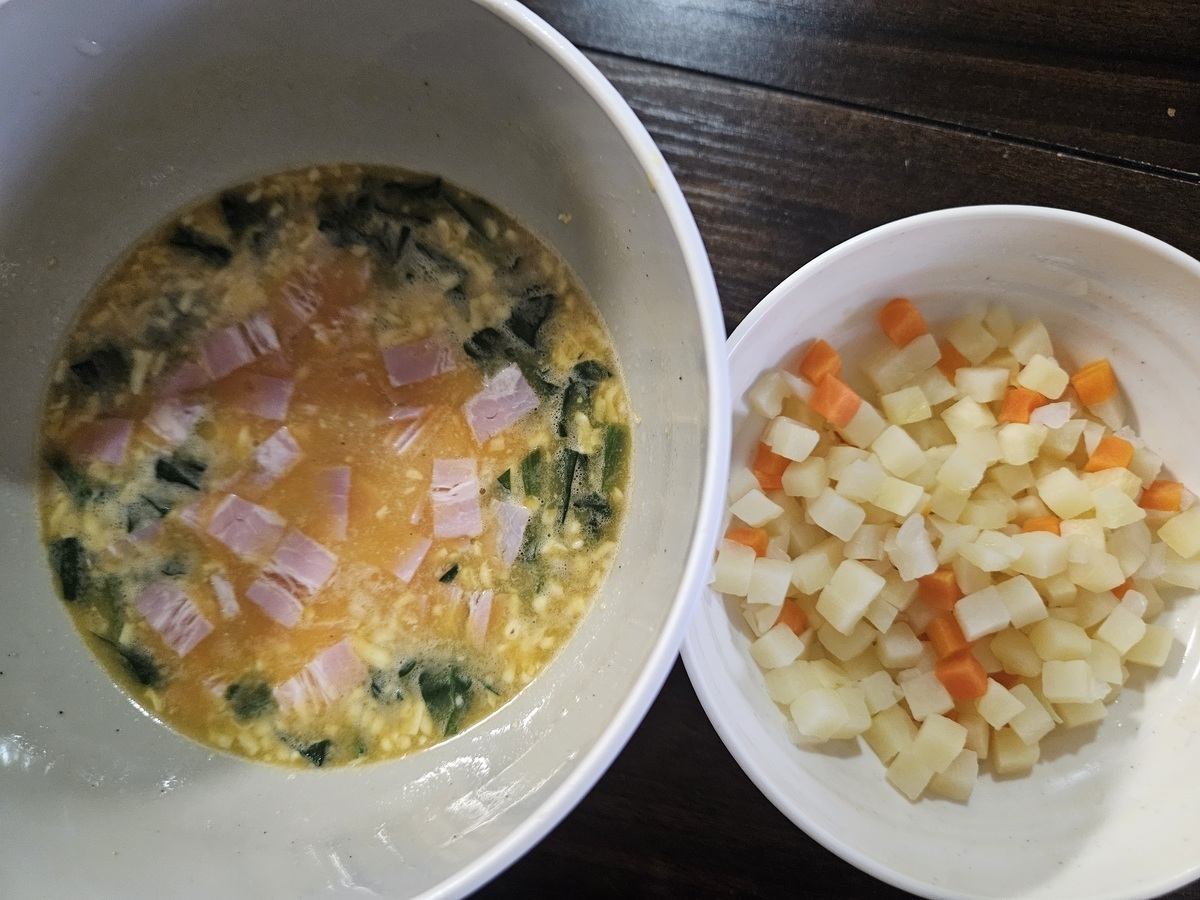 卵3個の分量に合わせた適量の『ポテトミックス』をレンジでチンします。