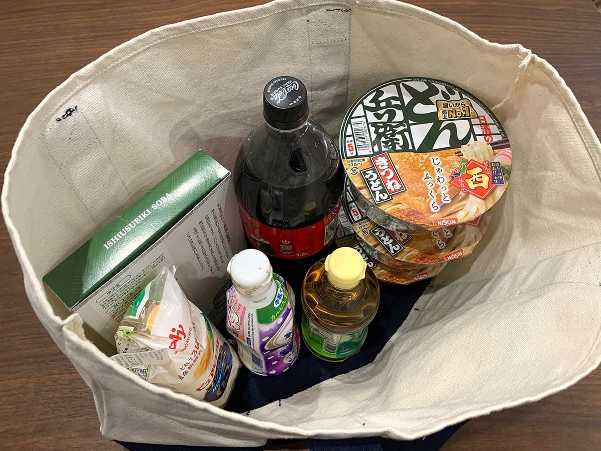 重ねたカップ麺3個や1.5Lペットボトルを入れても、上部はスッキリ収まるサイズ感!買い物時のエコバッグとしても活用できますよ♪