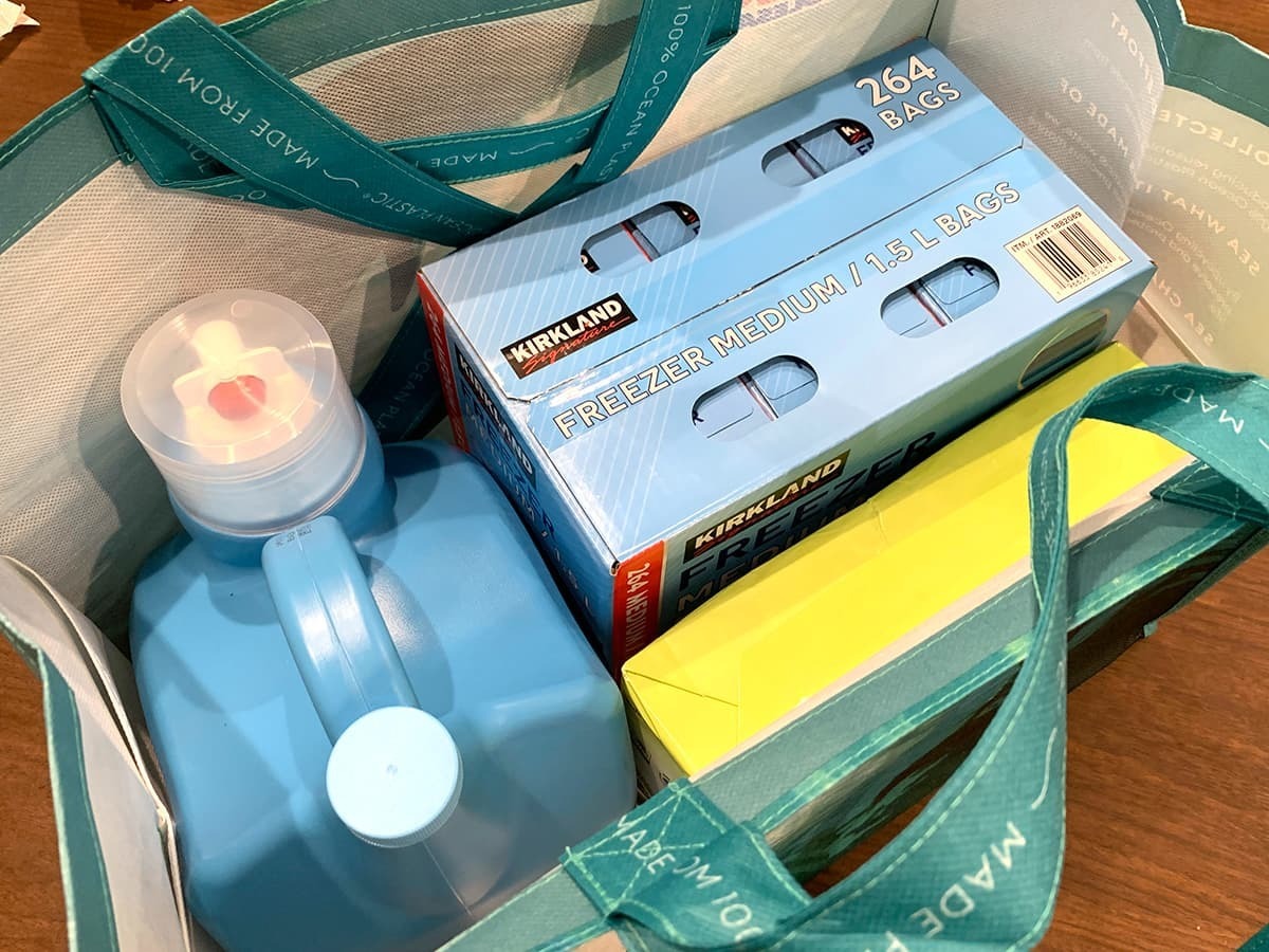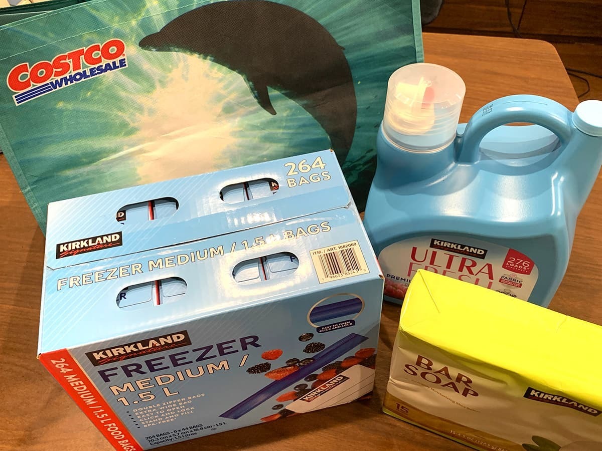 他にも、日用品として購入したコストコオリジナルの大容量品である柔軟剤、フリーザーバッグ、石鹸も入れてみます。