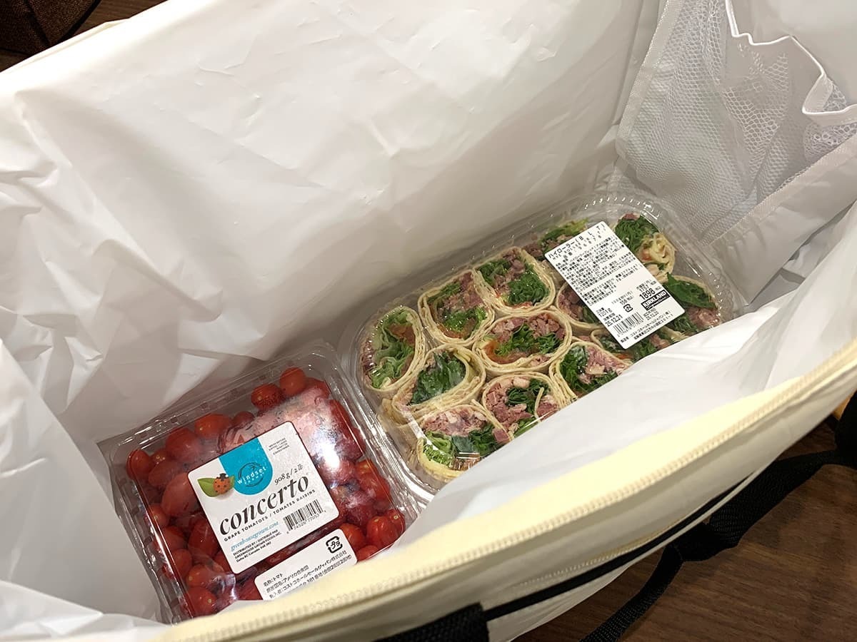 先ほどと同じハイローラー、湯田ヨーグルト、ミニトマト、マスカルポーネロールを入れてみましたが、まだまだ余裕のある容量!コストコの商品をまとめ買いしても、スッキリ収納できる大容量バッグです!