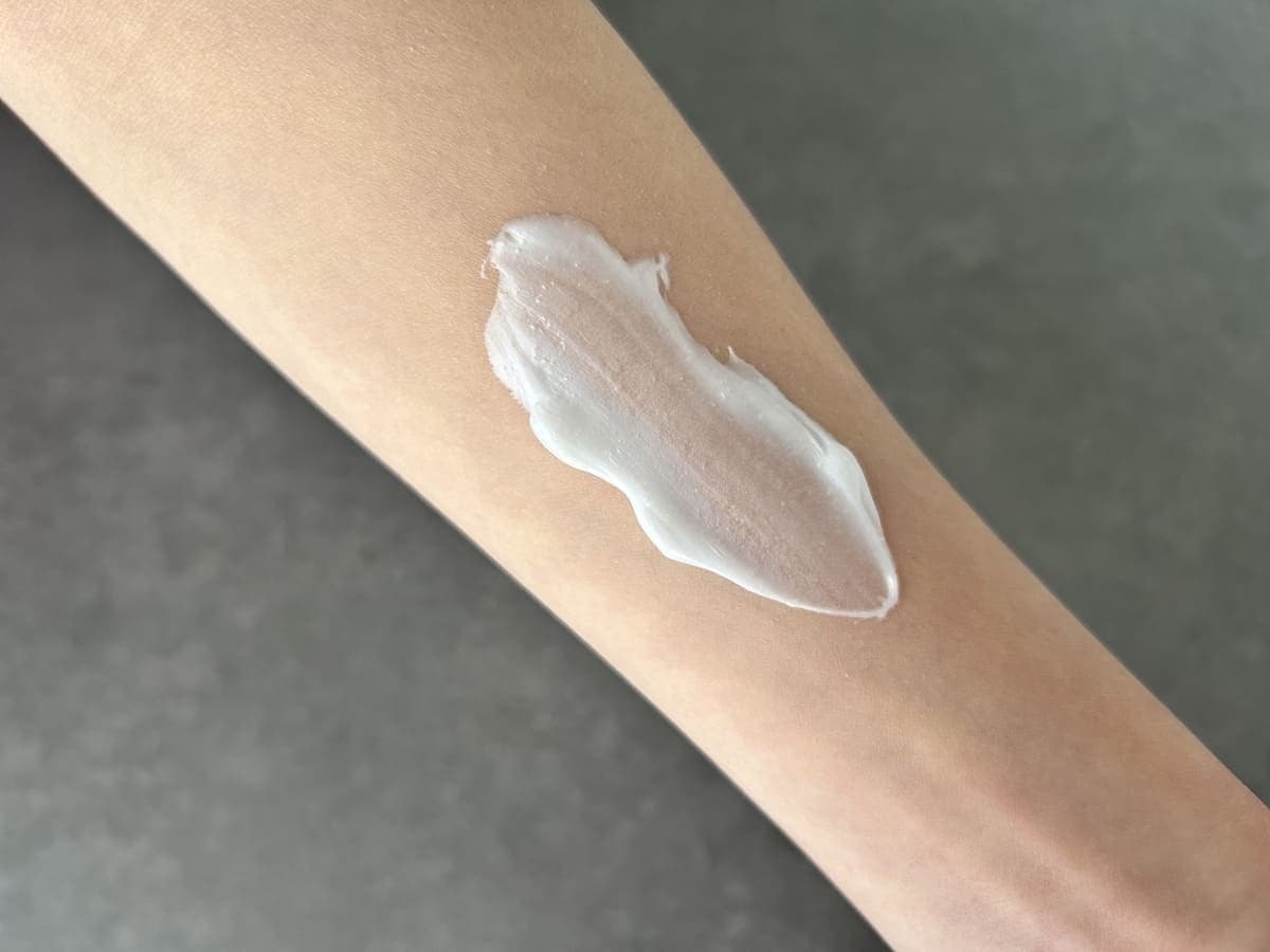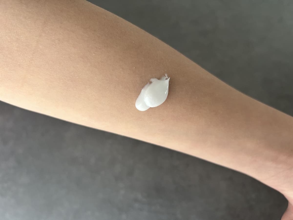 試しに腕にローションを出してみたところ、柔らかいクリーム状で心地良い!ベトベトした感じはなく、また伸びも良く塗りやすいローションで肌への馴染みも良好でした♪