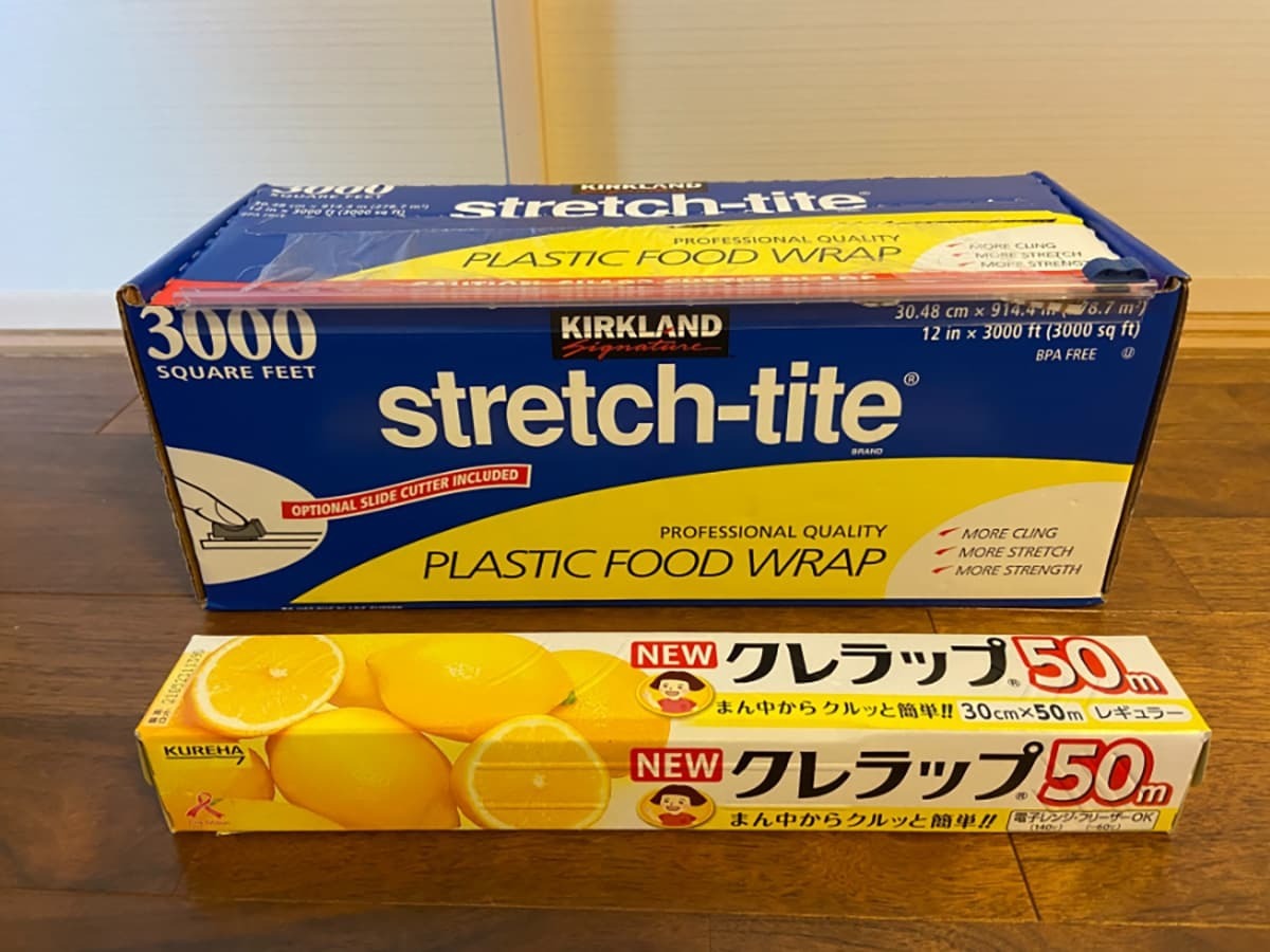 コストコのプライベートブランド商品で、コストコ会員からも高い評価を得ている日用品。市販のラップと中身を並べてみましたが、その大容量さは一目瞭然ですね!