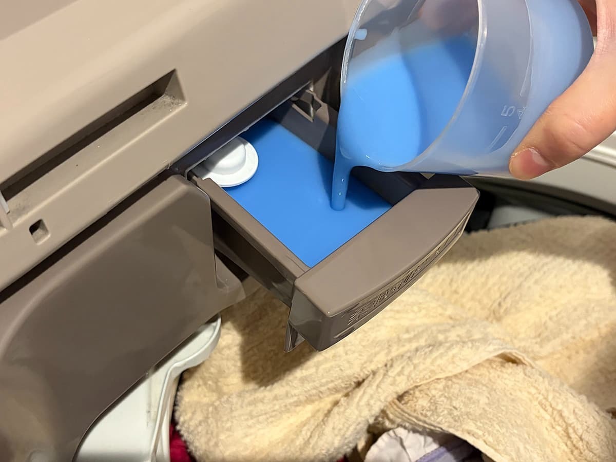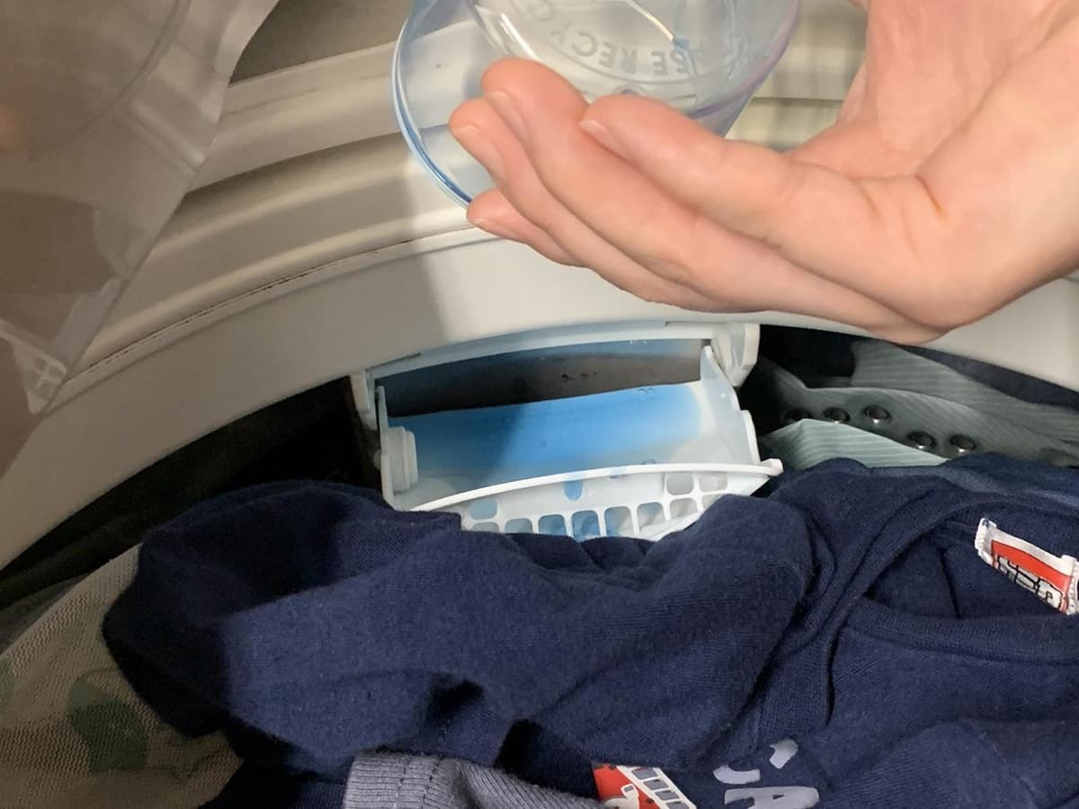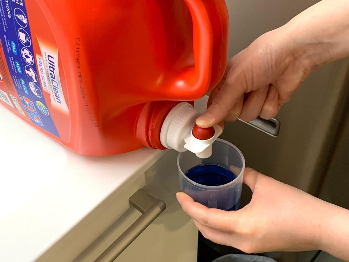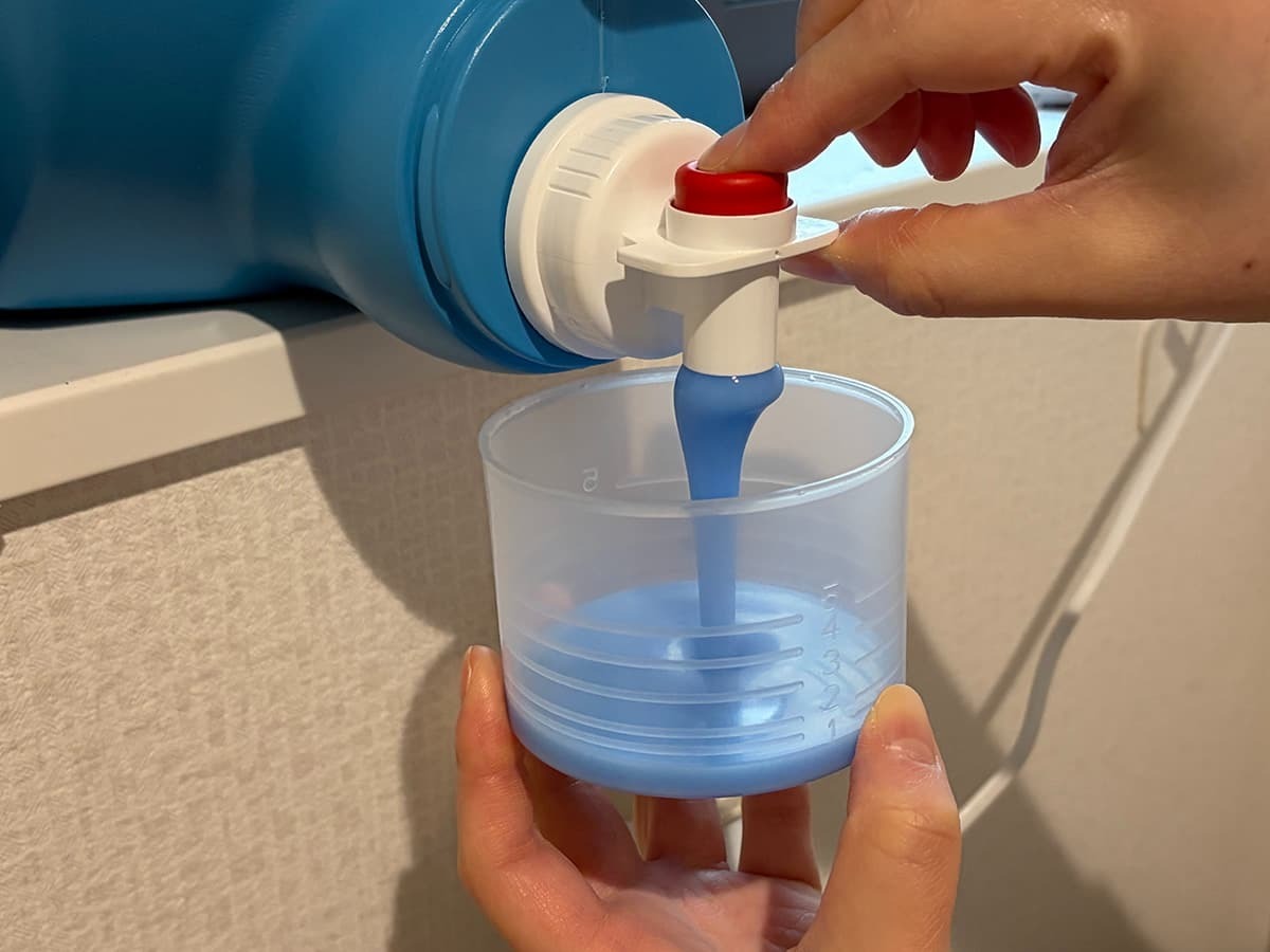 容器にはボタンが付いており、押すだけで中の洗濯洗剤を抽出可能。カップで洗濯洗剤を受け止め、そのまま洗濯機に注ぐだけです。