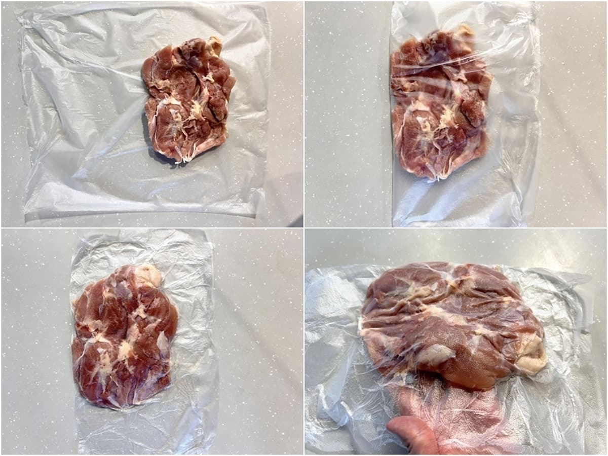 やり方は簡単で、まずプレスンシールを大きくカットし、上にお肉を乗せます。その後、空気を抜くようにプレスンシール同士をくっつけ、密着させれば完了です!