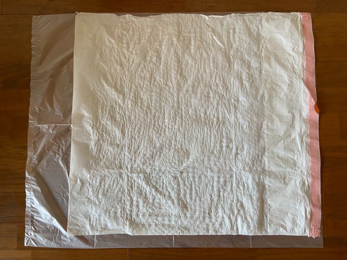 ゴミ袋の容量は49.2L、サイズは60.9cm×68.5cmとなっています。試しに、我が家でもよく使用している45Lのゴミ袋の上に、コストコのひも付きゴミ袋を置いてみました。
