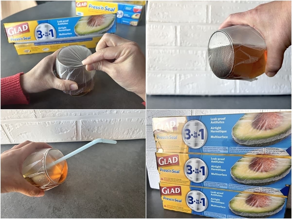プレスンシールにストローを差し込めば、即席の蓋付きコップの完成!いつも子供がコップの中身をこぼして大変…そんな悩みもプレスンシールで解決できます!