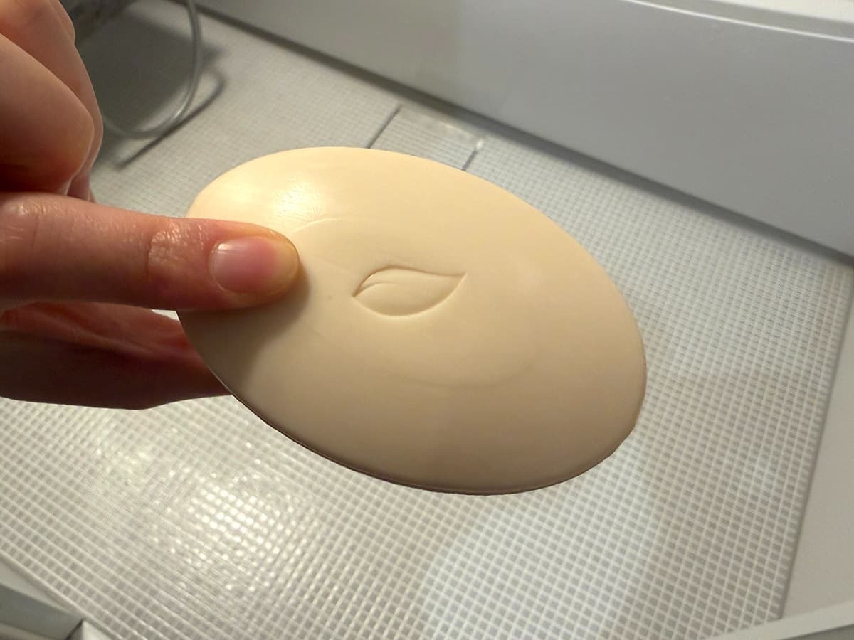 石鹸を袋から取り出すと、ふんわりフレッシュな香りが漂ってきました!強すぎないやさしい香りに包まれることで、入浴時間がホッと癒されるひとときになります♪