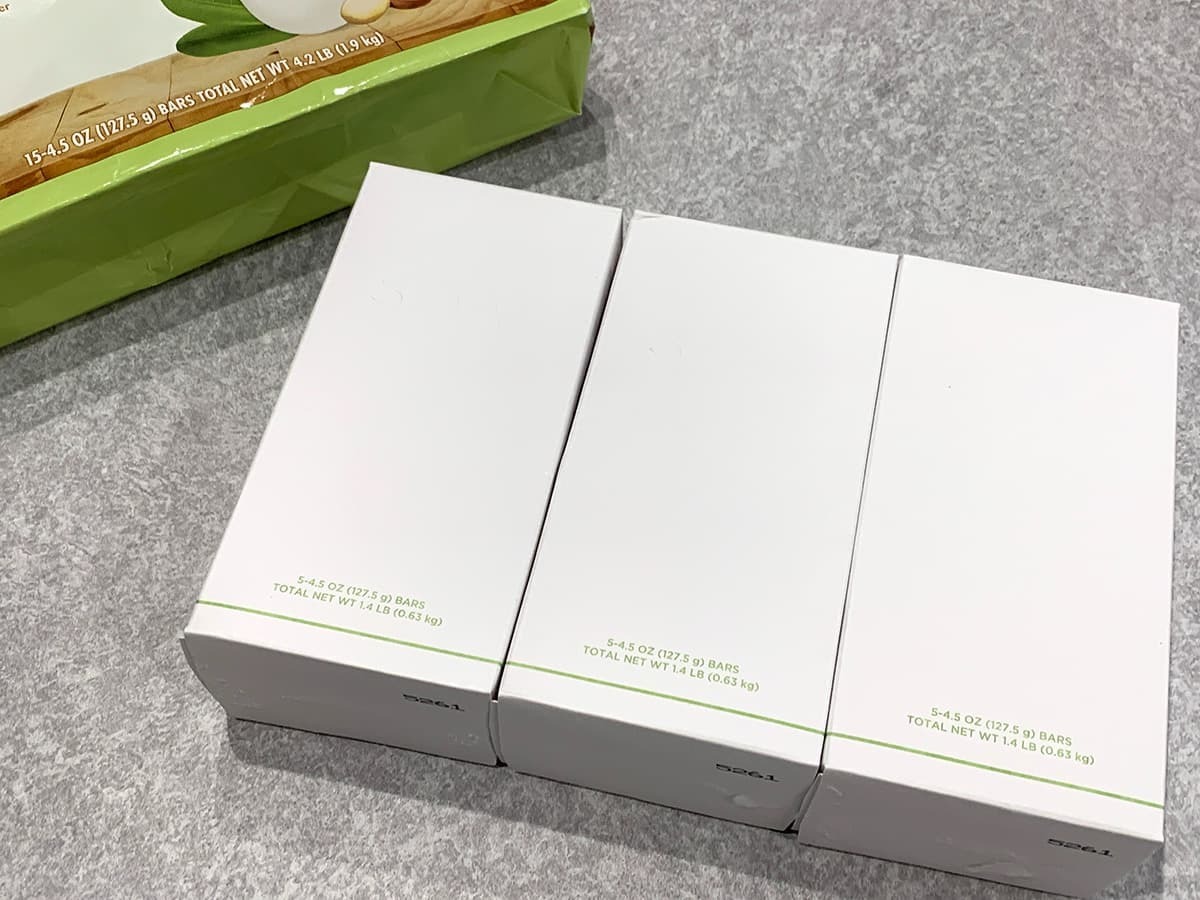 そして、箱の中にはそれぞれ石鹸が5個ずつ入っています。固形石鹸は液体石鹸に比べると長期間使用できるので、2,380円と聞くと少々割高に感じますが、長い目で見るとコスパに優れていると言えるでしょう!