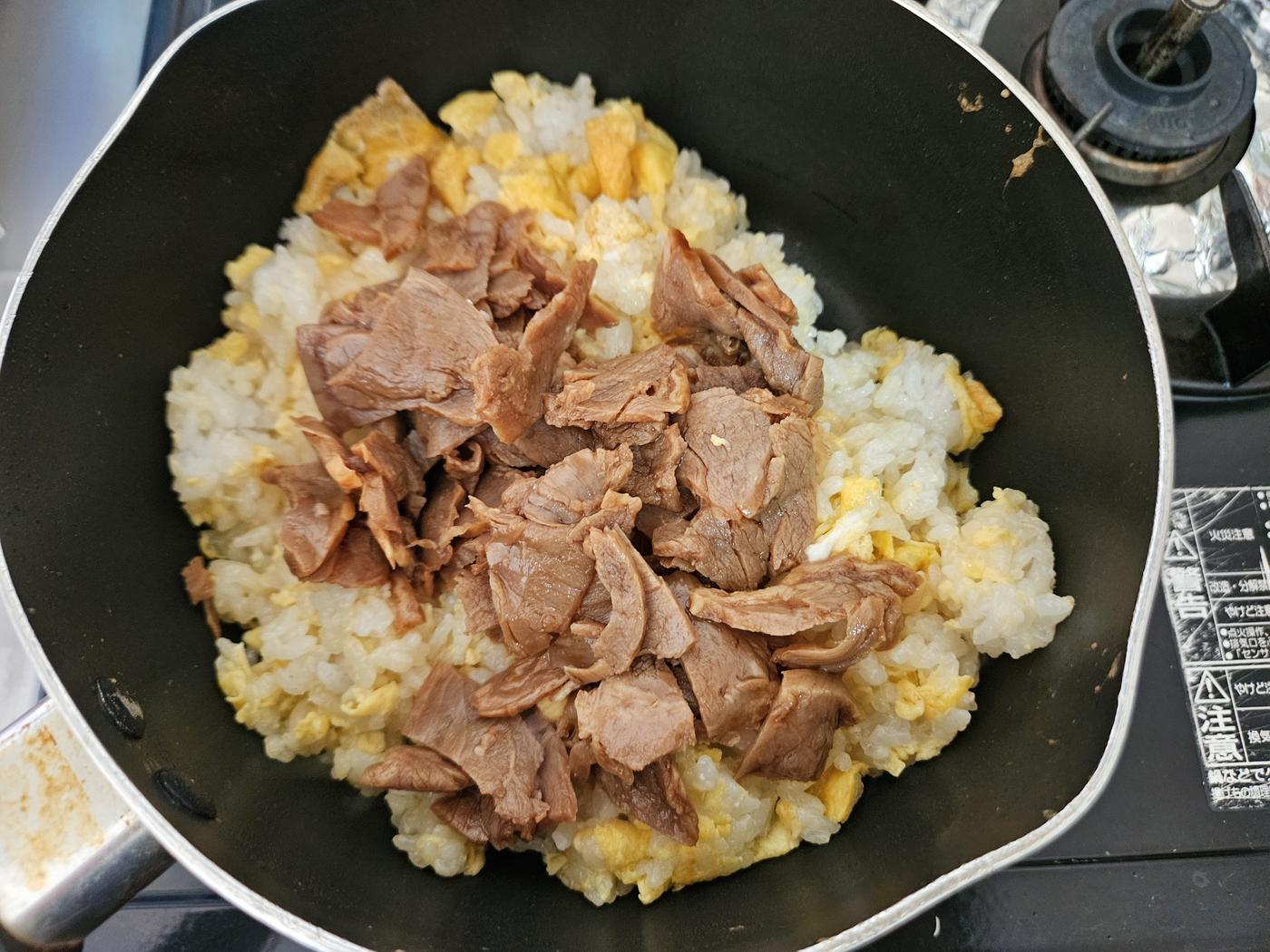 チャーシューには味が付いているので調味料は加えず、チャーシューに残っていたタレを絡めて焼きました。